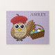 Uma ilustração de uma coruja de desenho animado giro vestindo um berço francês vermelho e segurando um cheio nativo castanho de ovos coloridos de pastel e páscoa. Esta adorável design de pássaros engraçada é uma ideia de presente para amantes e amantes de os animais da caça aos ovos de Páscoa. Personalize ou personalize este quebra-cabeça de quebra- cabeça adicionando seu próprio texto.