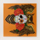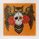 Este design ousado de coruja com caveira de açúcar combina o simbolismo do Día de los Muertos com um estilo gótico marcante. Uma coruja marrom detalhada com asas estendidas emoldura uma caveira de açúcar decorada com detalhes florais coloridos, um motivo de diamante e rosas vermelhas vibrantes. Contra um fundo laranja rico, esta obra de arte captura uma mistura dramática de sabedoria, mistério e beleza gótica romântica.