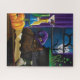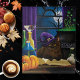 Gato colorido de chocolate com um chapéu de bruxa roxo. Cauldron, abóboras, poções, livro e quero sentar-se entre a véspera do gatinho das bruxas.