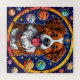 Cachorro alegre com pelo marrom e branco, proeminentemente colocado contra um fundo vibrante do espaço sideral. O cão está centrado em uma moldura circular decorada com planetas coloridos, estrelas e outros elementos celestes. Sua língua está para fora e tem uma expressão feliz, dando-lhe uma personalidade brincalhona. A combinação do cão e do tema cósmico cria uma atmosfera caprichosa e imaginativa. As cores são ousadas e brilhantes, realçando a vibração geral alegre da ilustração.