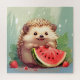 ilustração encantadora de um ouriço desfrutando um pedaço de melancia. O ouriço tem uma expressão feliz, com os olhos fechados em deleite, e está cercado por alguns morangos e folhas. O estilo de desenho de tinta adiciona um toque brilhante e fofo à cena.