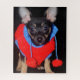Foto retrato adorável de um pequeno filhote vestindo um suéter de lã vermelho e azul suave com pom poms.