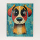 Esta design apresenta uma ilustração colorida de cão com olhos grandes e inocentes. Este design consiste num fundo azul, e é um excelente para amantes de cães.
