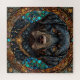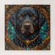Retrato altamente detalhado e estilizado de um cão labrador preto. A expressão do cão é impressionante, com olhos profundos e cheios de alma que transmitem inteligência e calor. Ao redor do cão há uma borda decorativa intrincada que combina elementos como pedras preciosas e padrões ornamentados, criando uma atmosfera mística e régia. O uso de cores ricas, particularmente azuis e dourados, realça o talento artístico, dando à imagem inteira uma qualidade fantástica. A coleira do cão parece embelezada, adicionando à elegância geral da peça.