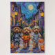 Cockapoos Adoráveis vestidos com fantasias lúcidas de Halloween carregar baldes de abóbora enquanto trick-or-tratando sob o céu iluminado. Este design festivo destaca a casaco, a natureza afetuosa e a personalidade alegre da raça, capturando perfeitamente a atmosfera assustadora e divertida da noite de Halloween. Uma celebração encantadora para amantes de cães e fãs do Halloween.