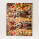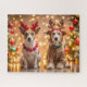 Dois cães grandes vestidos de rena posam perto de uma árvore de Natal. O fundo tem um efeito bokeh.