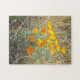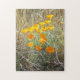 Os papagaios florescem num campo de grama. A luz do sol brinca com sombras nas pétalas laranja que se erguem acima de caules ligeiramente verdes que se misturam com as gramíneas marrons. California Poppy.