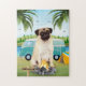 Pug Dog sentado perto do arquivo do acampamento e tenda com carrinha de camper no fundo do rio é uma bandeira perfeita do jardim se você for acampar.