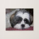 Um cão branco e preto bonito de Shih Tzu que estabelece em um rosa/cobertura cor-de-rosa. A imagem adorável da fotografia da raça do cão de Shih Tzu imprime.