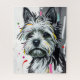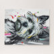 Imagem em preto e branco de um terrier sedoso, com pedaços de tinta colorida ao redor do cão. Cinza e fundo branco. Pintor rosa, vermelho, verde, azul e amarelo. Esta quebra-cabeça de Jigsera é excelente para doação de presente, ou para toda a sua família. Perfeito em uma clínica veterinária para manter as crianças ocupadas enquanto seu animal de estimação está sendo tratado.