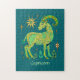 Quebra-cabeça em uma representação estilizada de uma cabra, intricadamente decorada com padrões de verde e amarelo, representando o signo zodíaco Capricórnio. Os elementos circundantes incluem símbolos celestes e designs de folhas.