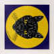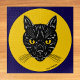 Uma ilustração retrô do rosto de um gato preto com olhos amarelos aparece em um círculo semelhante à lua nesta arte original apropriada para o Halloween de Richard H. Fay.