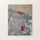 Um Cardeal em voo enquanto o outro se senta e contempla o que fazer.
