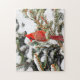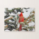 Cardeal masculino emperrado em um cheio de pinheiro de neve
