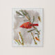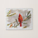 Cardeal masculino emperrado em um cheio de pinheiro de neve