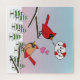 Um desenho animado de dois doces pássaros cardeais vermelhos-nortes se amando em uma paisagem de inverno de neve com um romântico cor-de-rosa e céu azul. Eles estão em ramos nuos de árvores. O macho está cantando uma canção de amor para a fêmea que escuta e manda para ele seus corações. Este design original faz uma ideia de presente de excelente para amantes de pássaros, amantes de paisagens, romance e amantes de música.