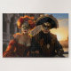 Um casal em uma fantasia rica de Carnevale com máscaras de ornamentado fica sobre uma ponte cobrindo um canal, com prédios barrocos ao fundo, à medida que o sol se põe sobre a cena. Belo e exótico quebra-cabeça de quebra-cabeça que você vai amar!