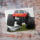 Um grande caminhão de monstro vermelho está esmagando um carro de salvamento automático. Legal para todos os amantes de caminhões.