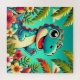 Ilustração colorida de um animado dinossauro azul num cenário tropical rodeado por folhas e flores, evocando vibrações lúdicas e caprichosas. Perfeito para temas da natureza, diversão e aventura.