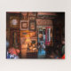 Uma pintura de uma casa vitoriana encantada e acolhedora com fotos, cadeiras de braço, uma lâmpada brilhante, relógio de avô e muito mais.