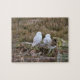 Foto original de um par de corujas nevado que sentam-se em um registro da madeira lançada costa pela praia cercada pela grama secada e pelas flores.