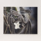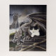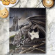 O gatinho de smoking preto e branco está sentado ao lado de um gárgula. Atrás deles está um castelo e dragões.