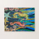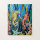 Um design artístico e colorido, com cavalos marinhos cercados por plantas oceânicas e algas marinhas.
