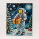 Esta vibrante design apresenta um astronauta num traje espacial de cheio segurando uma caixa de presentes de ouro, colocada contra um pano de fundo caprichoso de um céu noturno estrelado e uma árvore de Natal festiva. O contraste entre a vastidão do espaço e o calor das tradições de feriados torna esta imagem cativante e animadora.