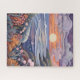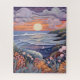 Quebra-cabeça de amor e o lago? Esta é a quebra-cabeça perfeita para você. Linda cena do sol sobre costas rochosas com ondas e flores silvestres. Sombras de laranja, azul, verde, rosa e roxo fazem uma deliciosa cena litorânea.