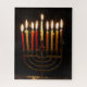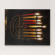 É Chanukah, o festival judeu de luzes. Esta simples menorah está acesa com todas as velas do dia 8 e da noite passada de Chanukah. Velas coloridas de cera de vermelho e amarelo acendem a escuridão. Aproveite esta quebra-cabeça durante o longo inverno para reacender memórias felizes da tradição familiar, rituais e união.