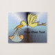 Chegada recém-nascida do bebê e entregado por uma cegonha do vôo. Imagem no vário presente e em produtos pessoais. Adicione por favor seu próprio texto.