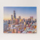 Esta quebra-cabeça única de quebra-cabeça mostra uma fotografia da bela cidade de Chicago, Illinois, ao pôr do sol. Esta quebra-cabeça faria uma ideia verdadeiramente maravilhosa para amigos e família.