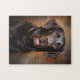 Um retrato aproximado de um Retriever Labrador de Chocolate, pintado em um estilo realista. O cachorro tem uma expressão amigável, com a língua levemente saliente e os olhos castanhos olhando diretamente para o observador. O pelo é feito com detalhes meticulosos, mostrando a textura e profundidade da casaco do animal. O fundo é um castanho macio e desfocado, criando uma sensação de profundidade e focando no rosto do cão. Presente perfeito para amantes do labrador.