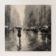 Uma cena impressionista moderna de uma rua da cidade em um dia chuvoso, com trânsito e prédios refletidos na calçada e uma mulher na calçada se abrigando sob seu guarda-chuva. Toneladas de sepia monocromática, trabalho de arte gerado artificialmente.