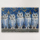 Esta quebra-cabeça de serra apresenta cinco corujas brancas em pé em fileira com um fundo azul e dourado de pulgas. Seria um belo presente para um entusiasta do quebra-cabeça.