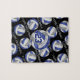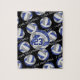 Esta quebra-cabeça de quebra-cabeça para raparigas apresenta uma cinza e uma arte branca maiores, um vôlei estilizado, sobre o qual o seu nome e número de camisola podem ser personalizados, sobrepondo-se a um padrão de azul mais pequeno, cinzas e volichões brancos num fundo negro e texto do estilo varsity em cinzas que se estendem entre as filas angloriadas de volleybolas - por katz_d_zynes