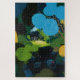 A ilustração digital mostra uma floresta noturna e um lago tranquilo. Vários cisnes pretos com bicos vermelhos flutuam pacificamente sob o salgueiro florescente na superfície da água. Na costa distante do lago, você pode ver uma pequena casa em um pomar de árvores. Toda a ilustração está cheia de uma atmosfera mágica e misteriosa