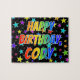Esta vibrante e divertida design de quebra-cabeça de quebra-cabeça com tema de aniversário tem a mensagem "HAPPY BIRTHDAY, CODY" com os personagens que têm um espectro colorido de arco-íris inspirado em um padrão de gradação, além de um campo vivo de estrelas como padrão de fundo. Um quebra-cabeça vibrante como este pode ser usado para enviar cartões de aniversários a alguém chamado Cody. [~Z0000468]