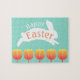 Adicione esta quebra-cabeça de Páscoa adorável às cestas de Páscoa do seu filho este ano! A quebra-cabeça tem uma silhueta branca e bonita saltando sobre um campo de tulipas laranja design com a frase "felz pascoa".