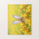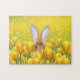 Coelho coelho a espreitar do quebra-cabeça de tulipas amarelas