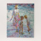 Uma mãe, com o chapéu de sol ligeiramente inclinado, guia duas crianças por uma poça de mar cintilante, cheia de cores e luz. Eles se inclinam com curiosidade, procurando tesouros marinhos sob as ondulações — conchas, pedras, talvez memórias. A cena captura a inocência da infância e a força tranquila da presença materna. As ondas brilham em tons de turquesa e lavanda, enquanto sombras suaves dançam na areia banhada pelo sol. Há movimento, mas também quietude — como um momento suspenso no ar quente e salgado.