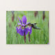 Um colibri rubi-throated que alimenta em uma íris roxa.