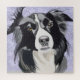 Este quebra-cabeça de quebra-cabeça mostra um esboço do meu Collie Gypsy, preto e branco, na fronteira, contra um fundo azul com padrão.