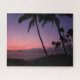 quebra-cabeça de um céu rosa e roxo fotográfico durante um pôr do sol em uma praia com palmeiras pretas na ilha tropical de Maui, Havaí.
