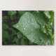 Desafiando o quebra-cabeça com gotas de chuva nas folhas. Uma visão de verdes profundos com luz e sombras. Quebra-cabeça monocromático que é relaxante e desafiador!