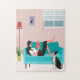 Quebra-cabeça de uma garota lendo um livro enquanto se deitava no sofá com uma Boston Terrier sentada perto dela na frente do sofá. Obrigados para Pixabay e Creative Fabrica para alguns dos elementos do design.