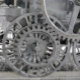 Um design fotográfico das rodas de um modelo inicial de um trem a vapor.