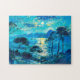 cena noturna impressionista de uma baía tranquila sob o luar. Os azuis profundos, reflexões brilhantes, e pinceladas sonhadoras evocam uma atmosfera marítima mágica.