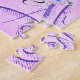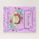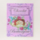 Uma placa de compro de pastelaria com bolo de chocolate e flores. Em cores rosa e roxo.