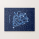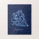 Quebra-cabeça com o símbolo do zodiac de Aquário em azul-prata suave, sobreposto com as estrelas da constelação, contra um fundo do céu estrelado formando do azul-da-meia-noite ao preto.